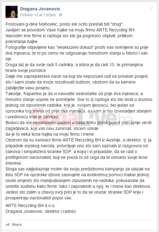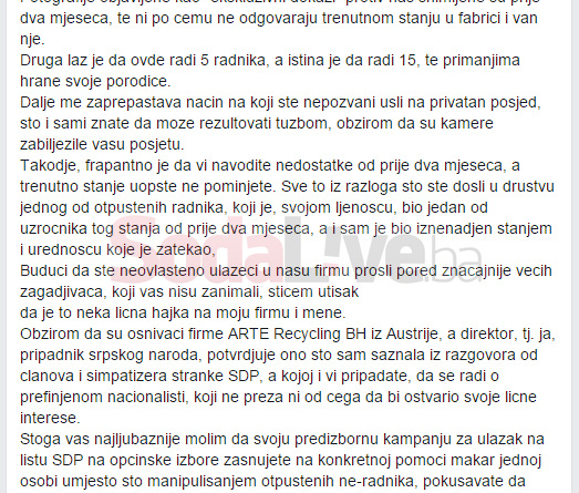“Budući da ste neovlašteno ulazeći u našu firmu prošli pored značajnije većih zagađivača koji vas nisu zanimali, stičem utisak da je to neka lična hajka na moju firmu i mene. Obzirom da su osnivači firme ARTE Recycling BH iz Austrije, a direktor, tj. ja, pripadnik srpskog naroda, potvrđuje ono što sam saznala iz razgovora od članova i simpatizera stranke SDP, a kojoj i vi pripadate, da se radi o prefinjenom nacionalisti, koji ne preza ni od čega da bi ostvario svoje lične interese“. (Izvor: Facebook)